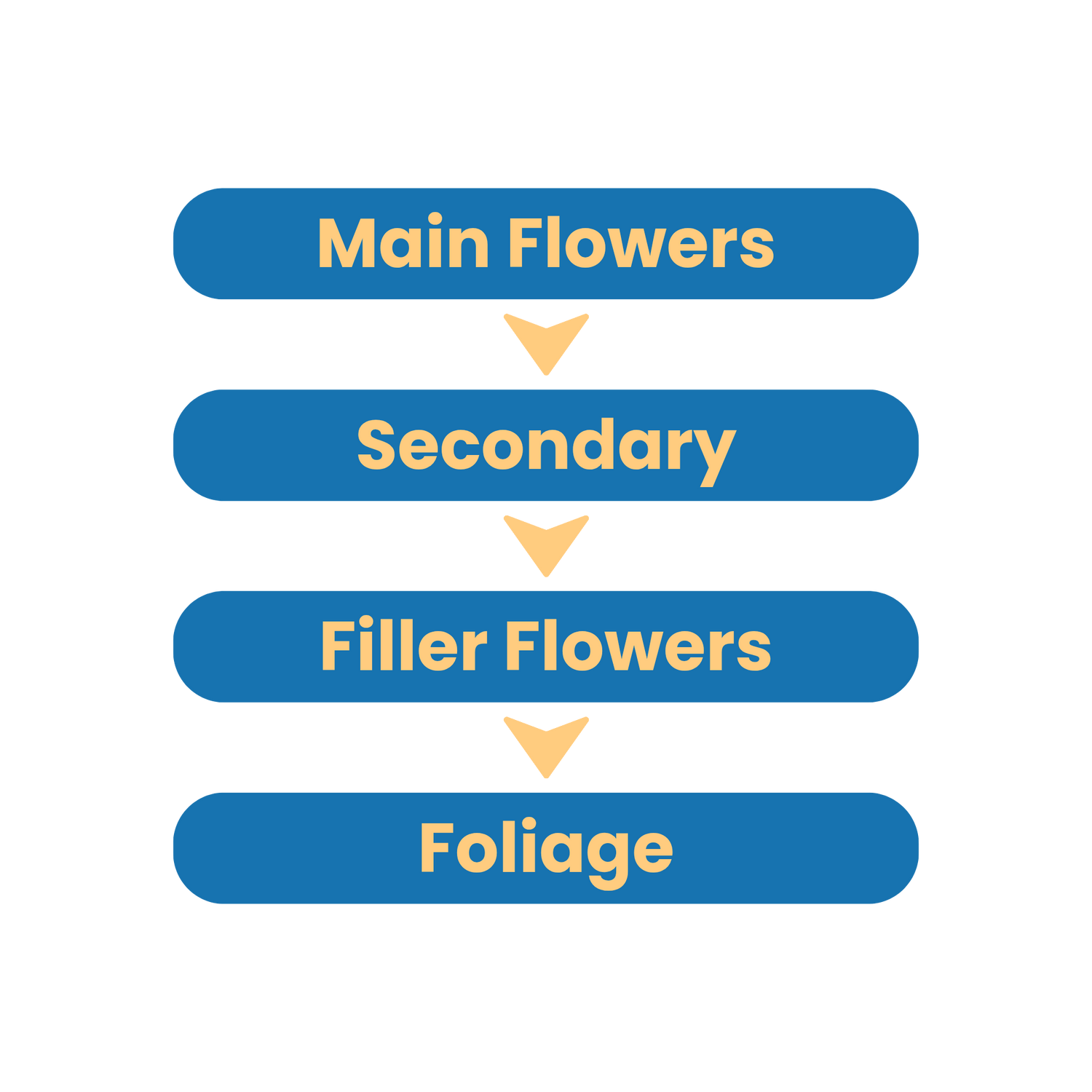 Start with your ingredients — main blooms, secondary flowers, fillers, and foliage. Every bouquet begins one stem at a time.