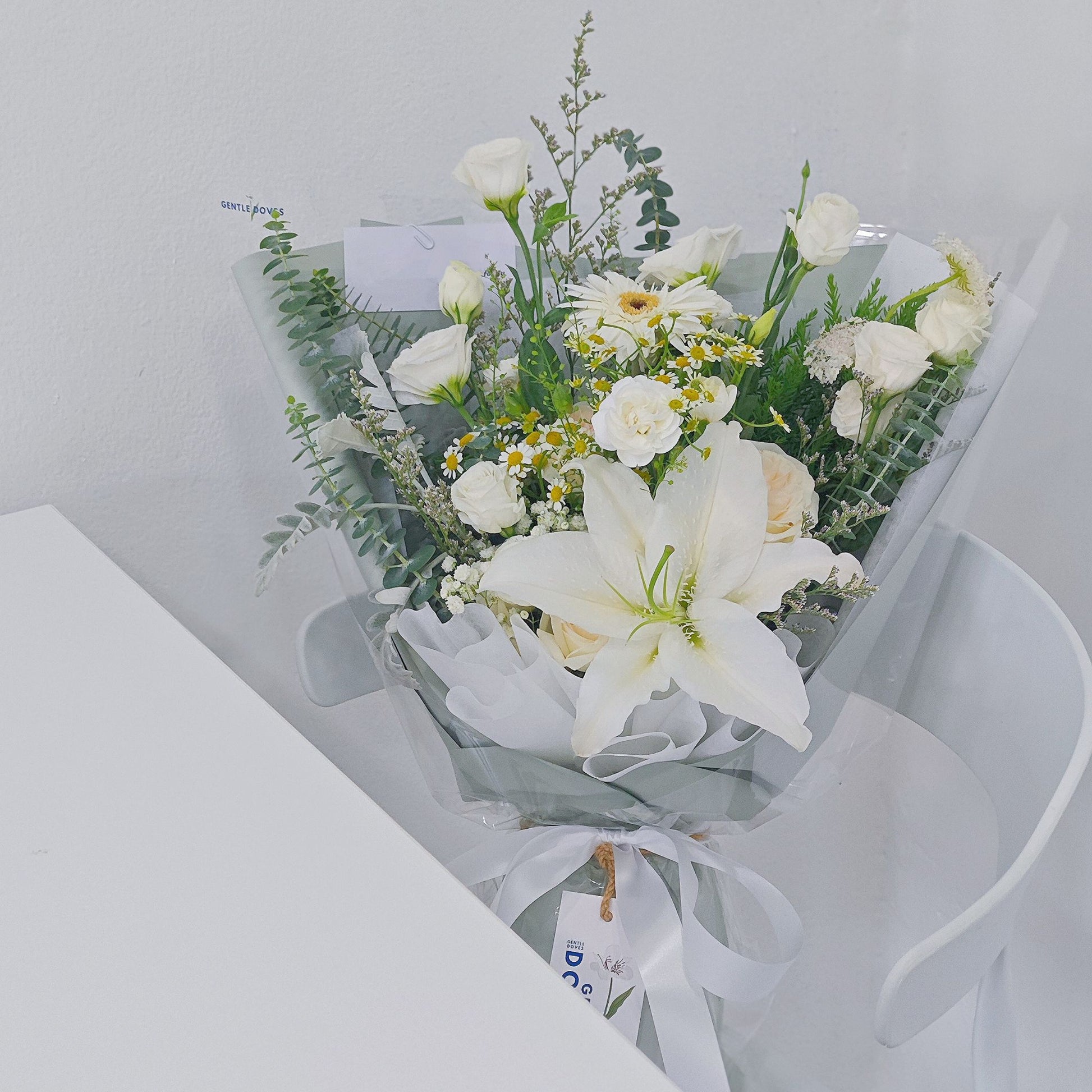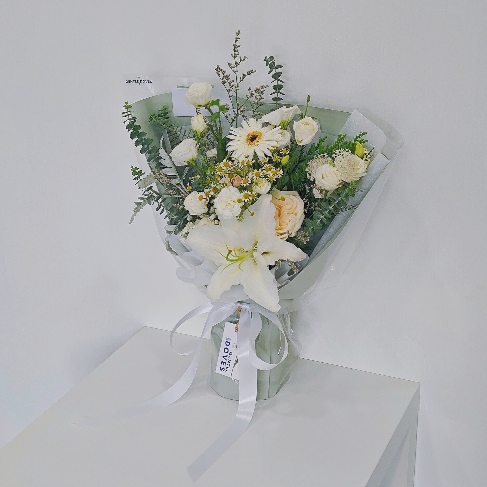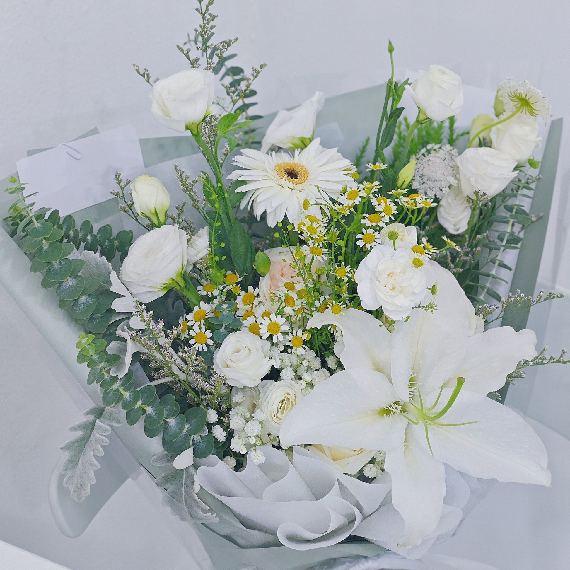 Indulge in the beauty and fragrance of our Assorted White Tone Flowers in Pastel Green Paper Bouquet. Perfect for anniversaries and dates, this bouquet is a risk worth taking. Let the soft colors and delicate scents inspire you as you embark on new adventures with your loved one.