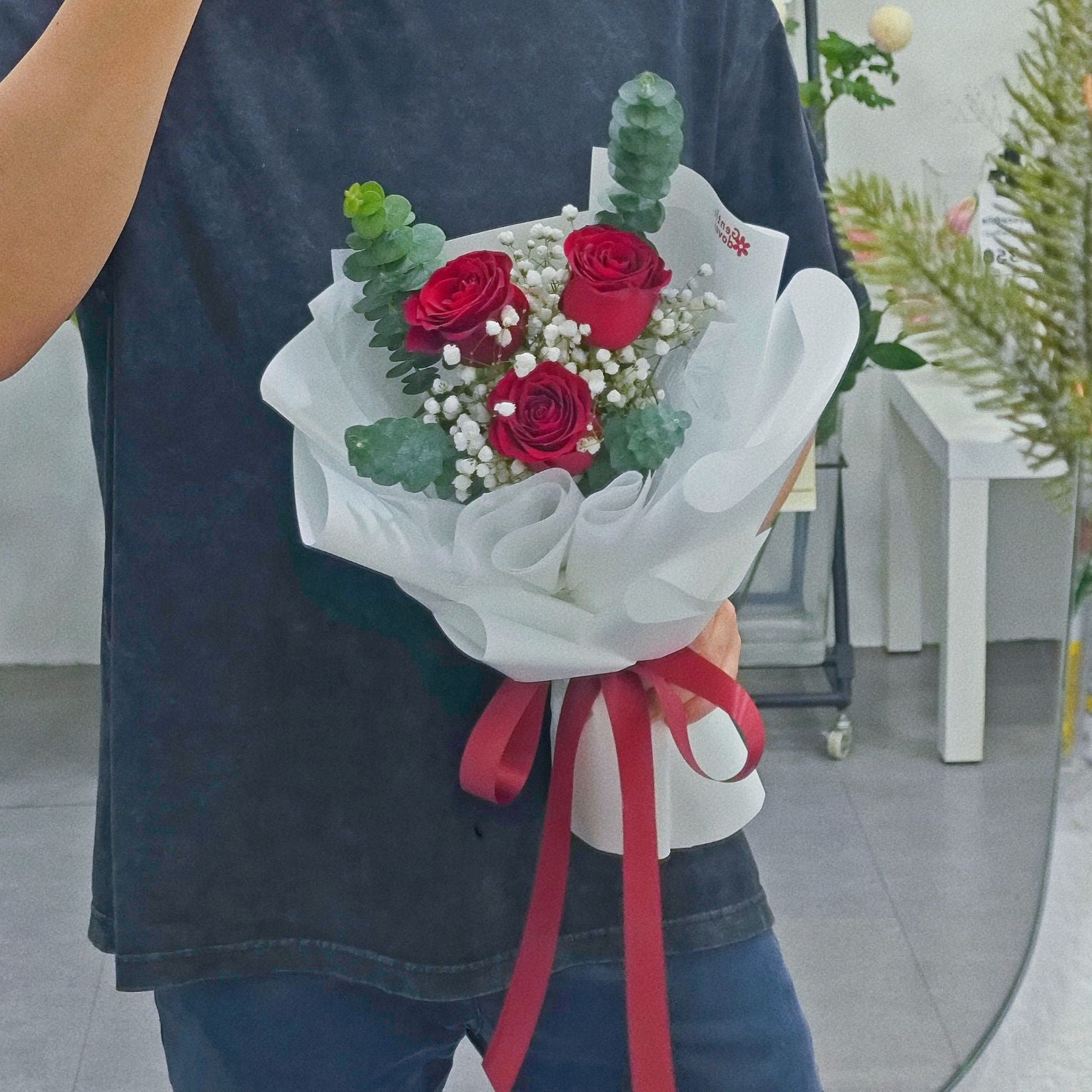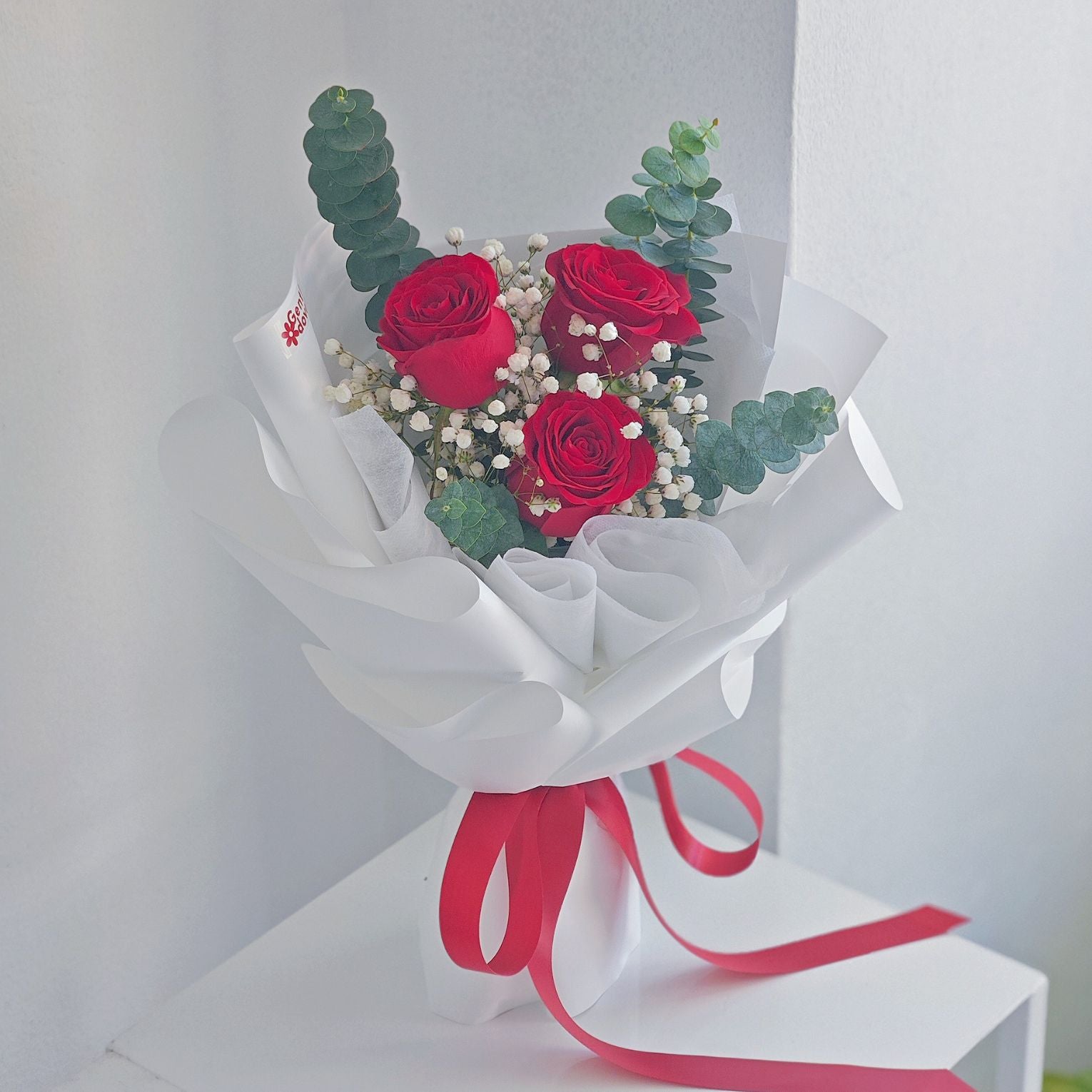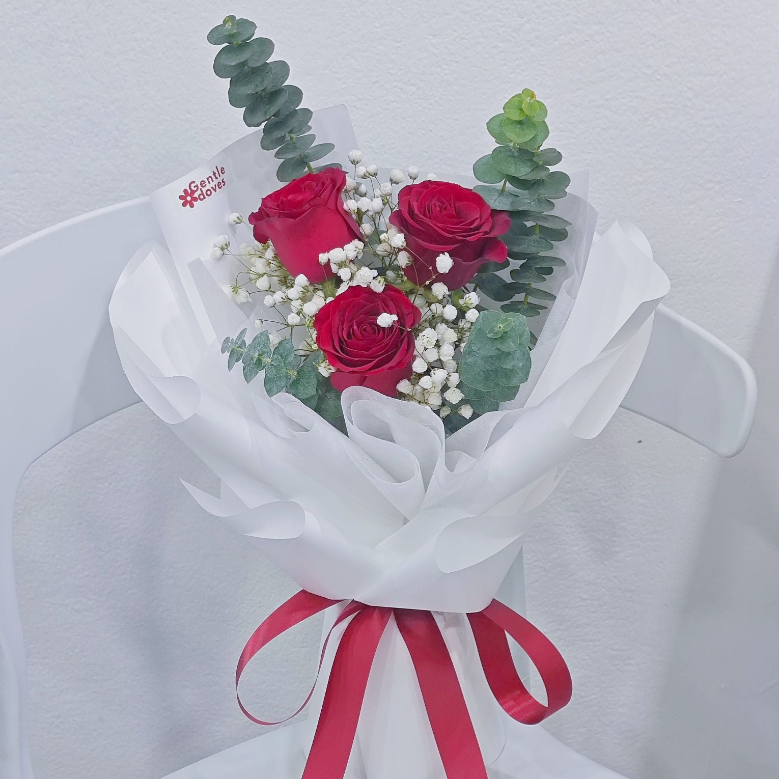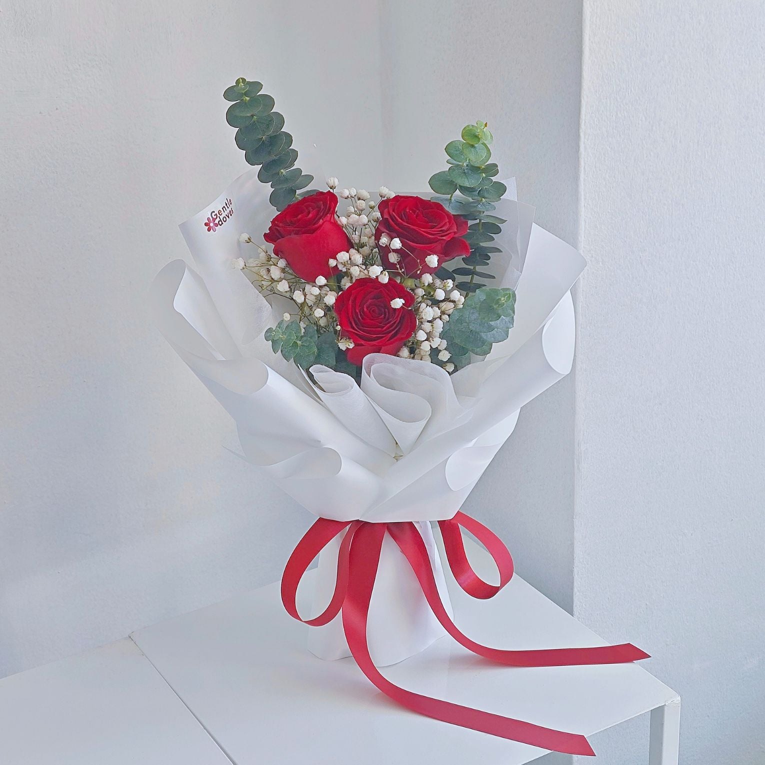Three roses carry the sense of affirmation — love chosen again and again, not assumed. Framed with white baby’s breath and eucalyptus, the arrangement remains balanced and focused, allowing the character of the roses to lead.