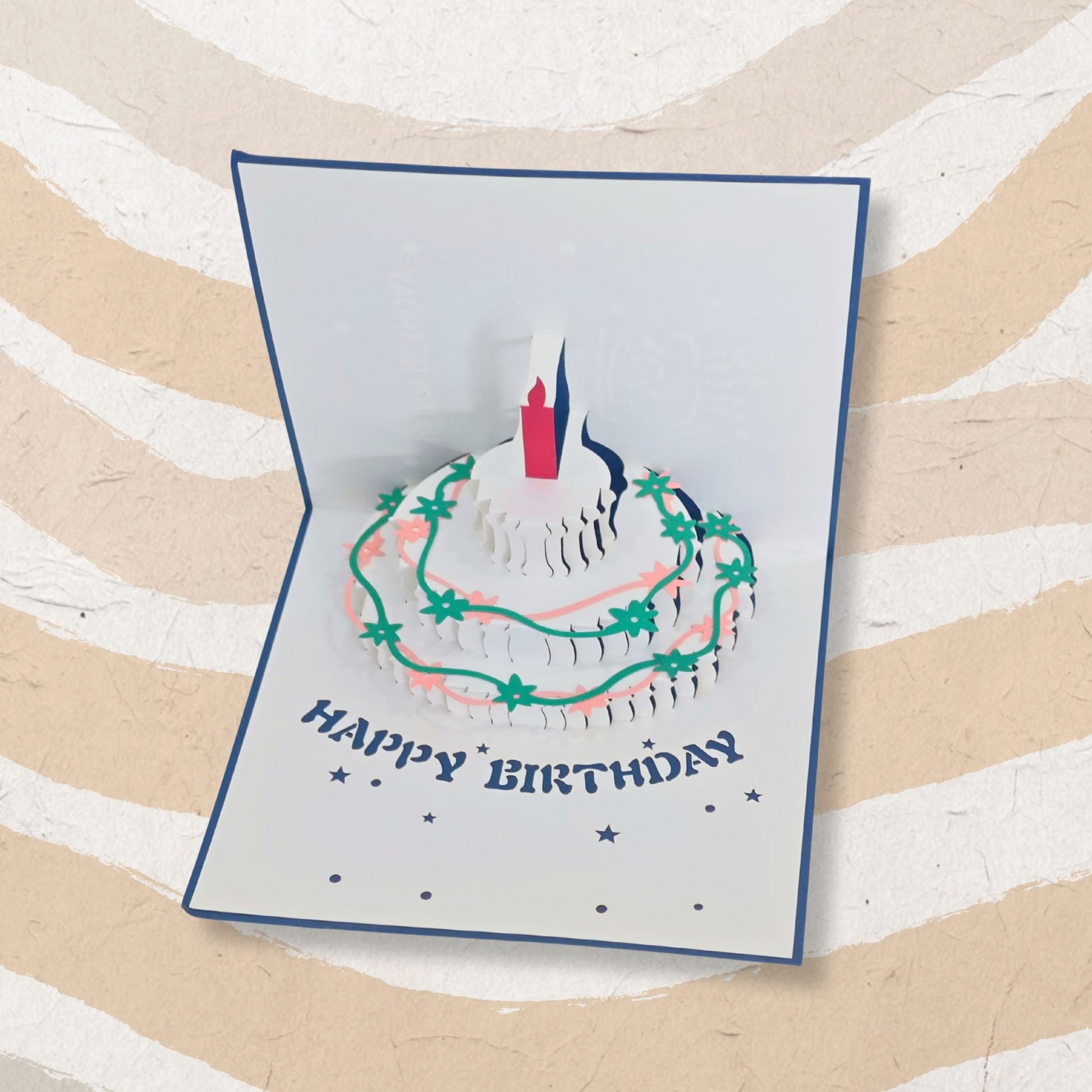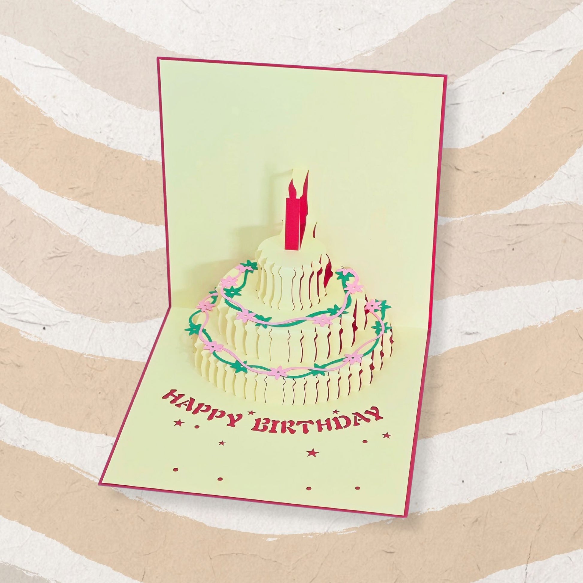 A square folded birthday card (15 x 15 cm) featuring a 3D pop-up paper cake inside. When opened, the paper cake structure pops up automatically, adding a cheerful and eye-catching surprise.