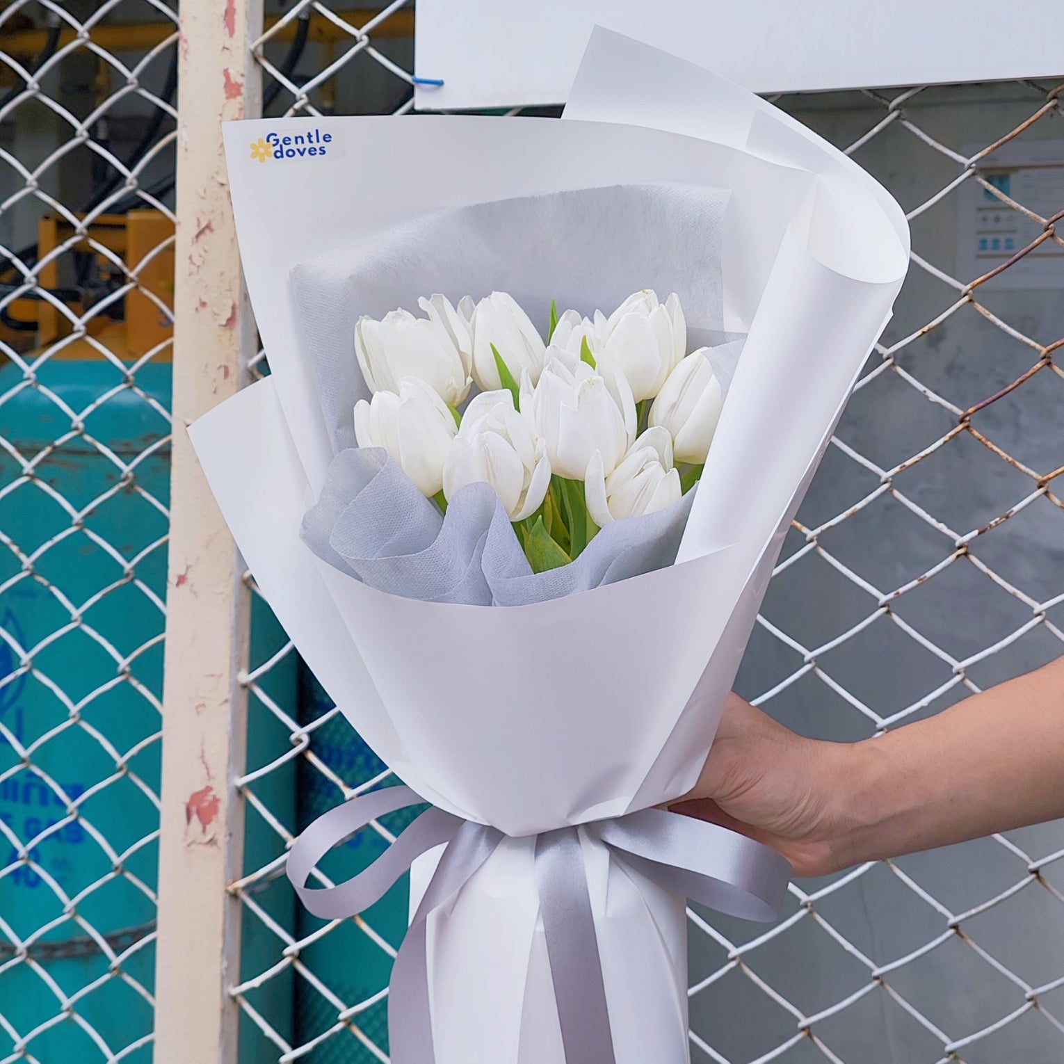 This Valentine’s bouquet features fresh white tulips, chosen for their quiet clarity and understated beauty. White tulips are often associated with sincerity and respect — a gesture that feels thoughtful, composed, and free from excess.