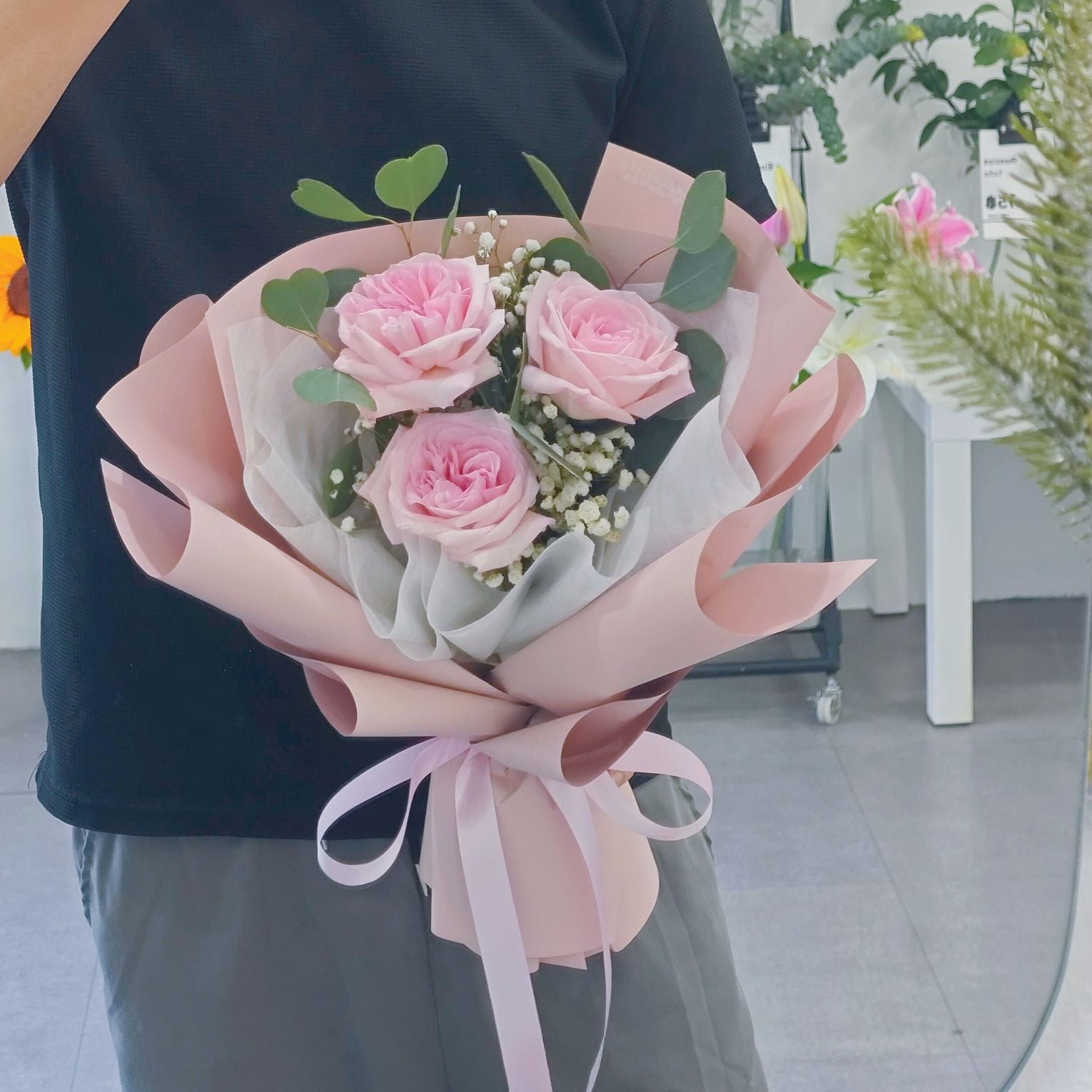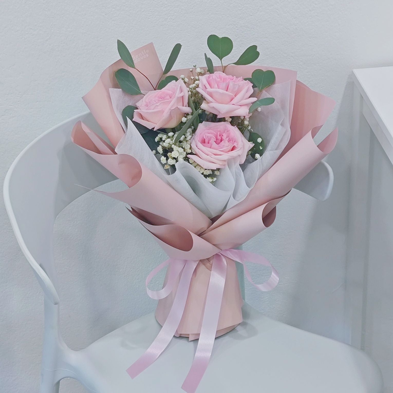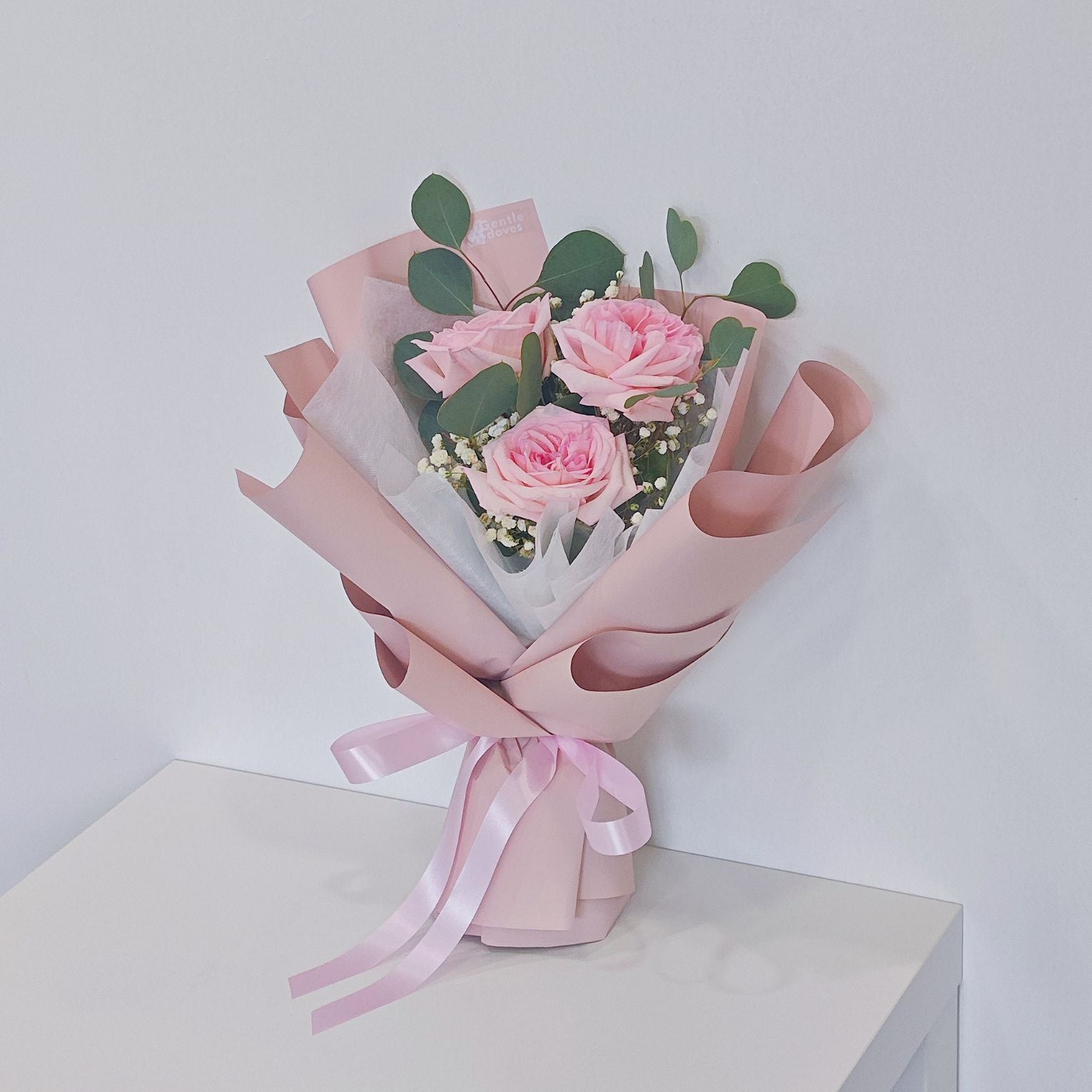 This Valentineâs bouquet is designed for affection that has settled into certainty. Three pink English roses, Thai locally grown, open wide at the centre â known for their soft fragrance and layered bloom, offering a presence that feels warm rather than showy.