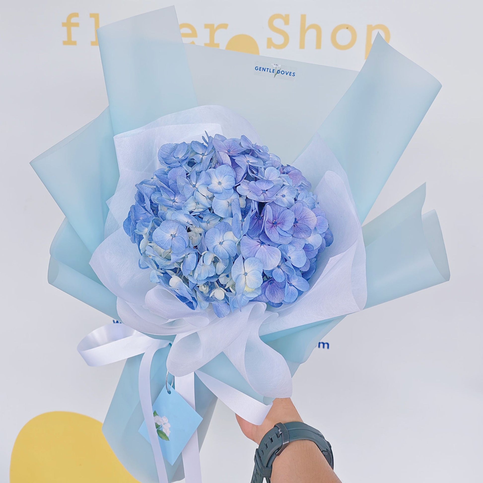A single fresh blue hydrangea, wrapped in soft blue paper with a medium-sized wrapping technique yet full presentation for an elegant and generous look. Perfect for any occasion where you want to give a calming, eye-catching gift â ideal for celebrations or brightening someoneâs day.