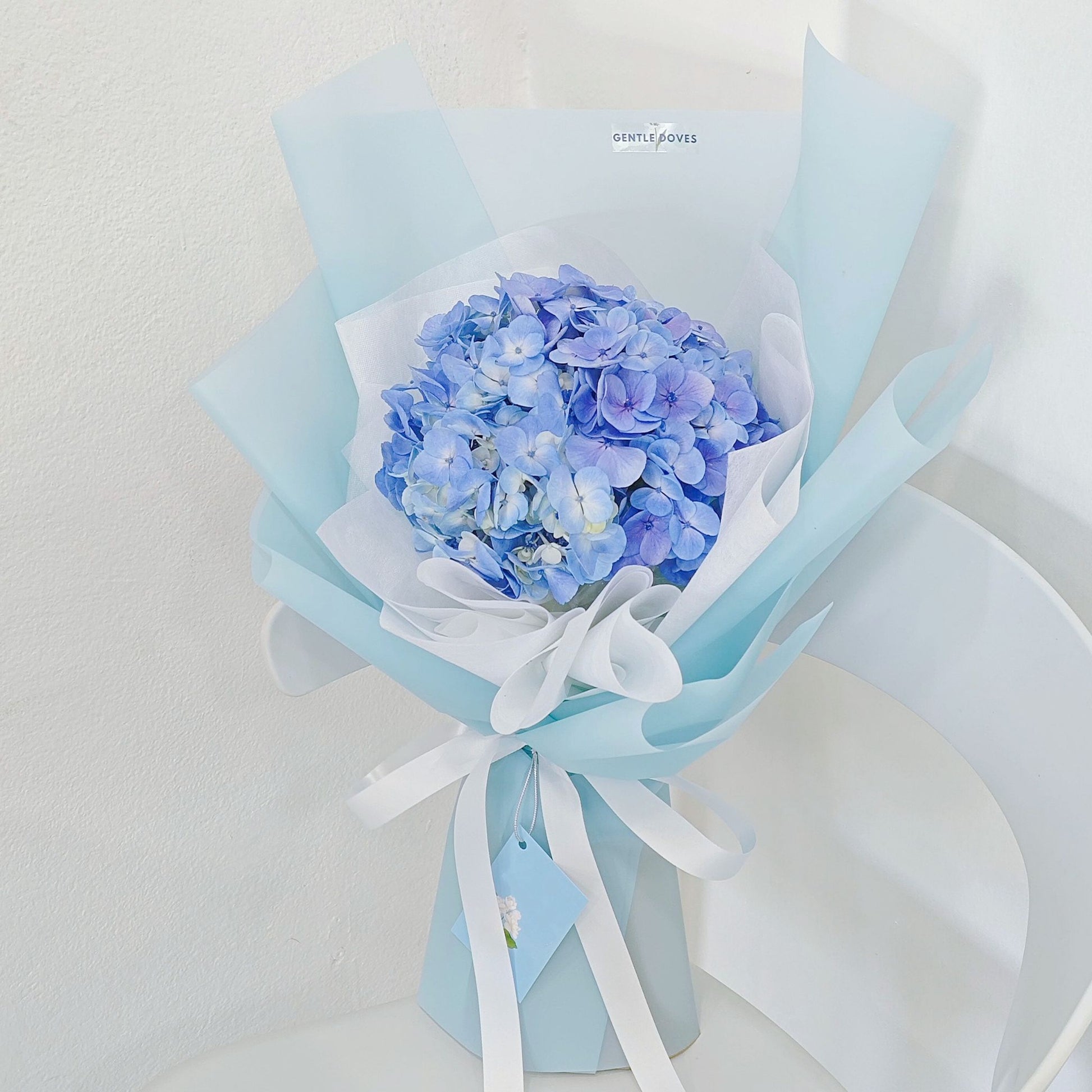 Single Blue Hydrangea in Soft Blue Paper Bouquet