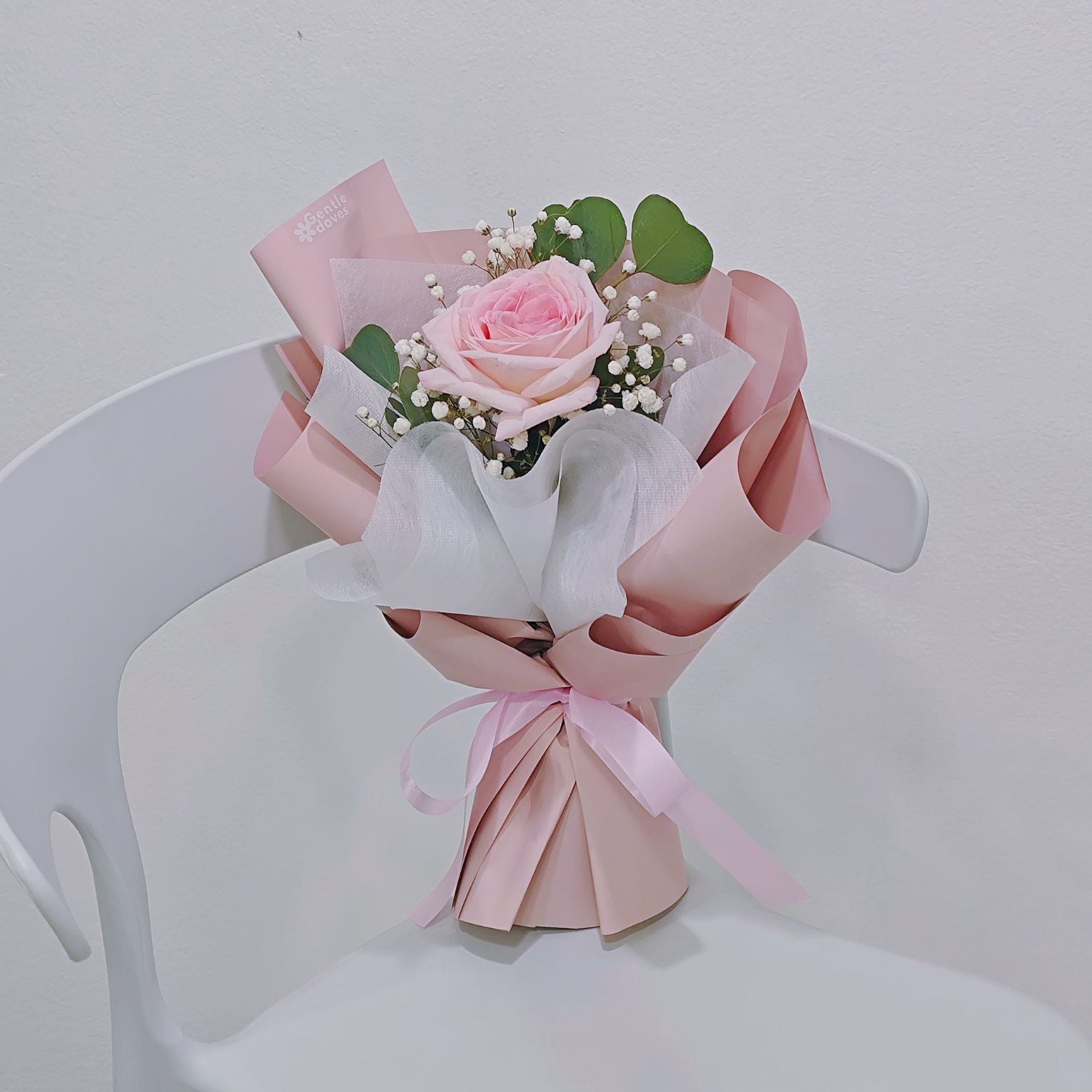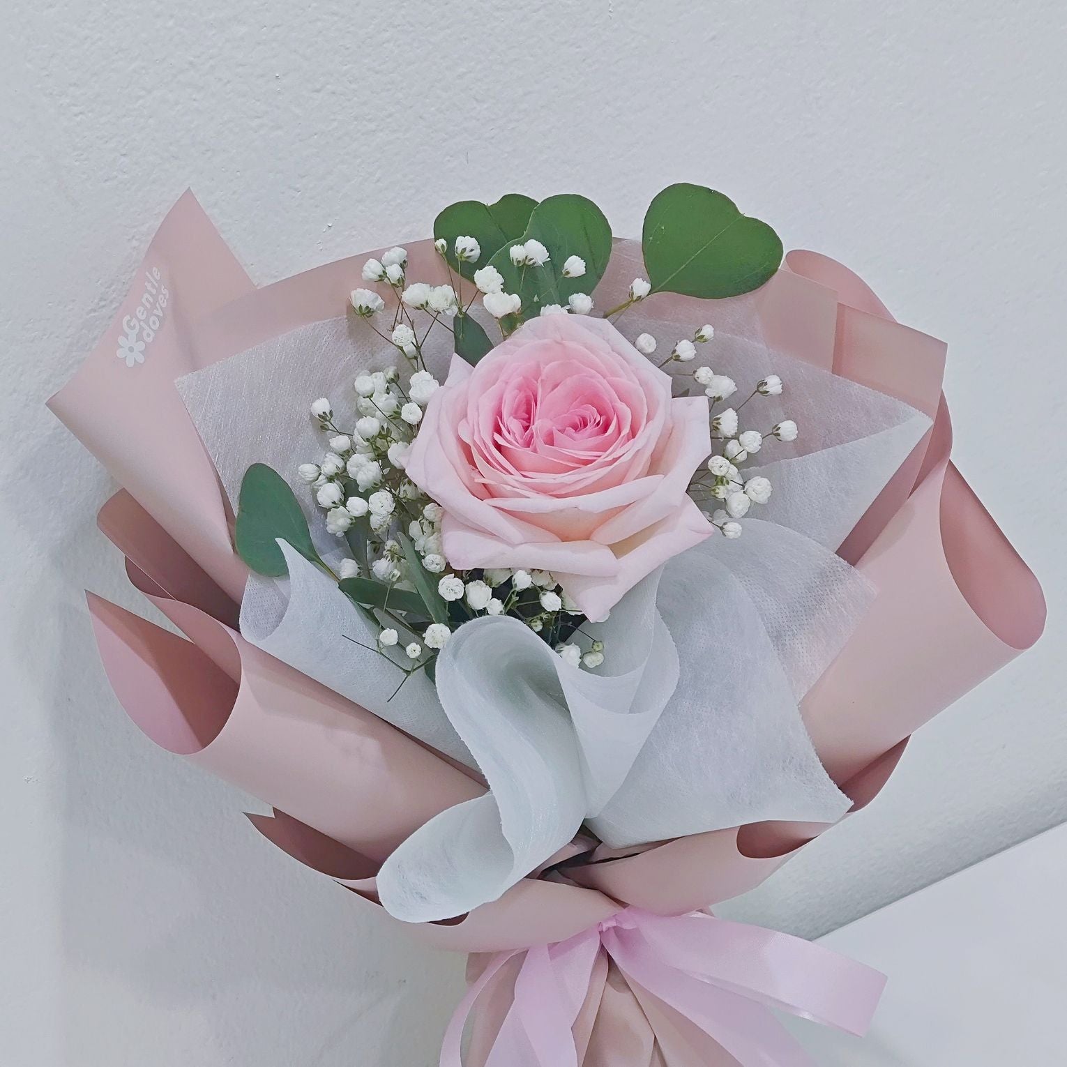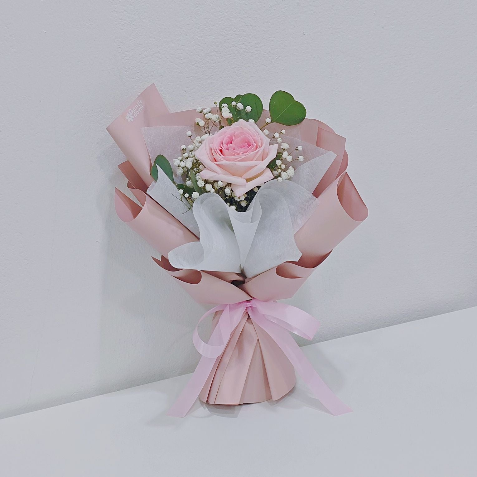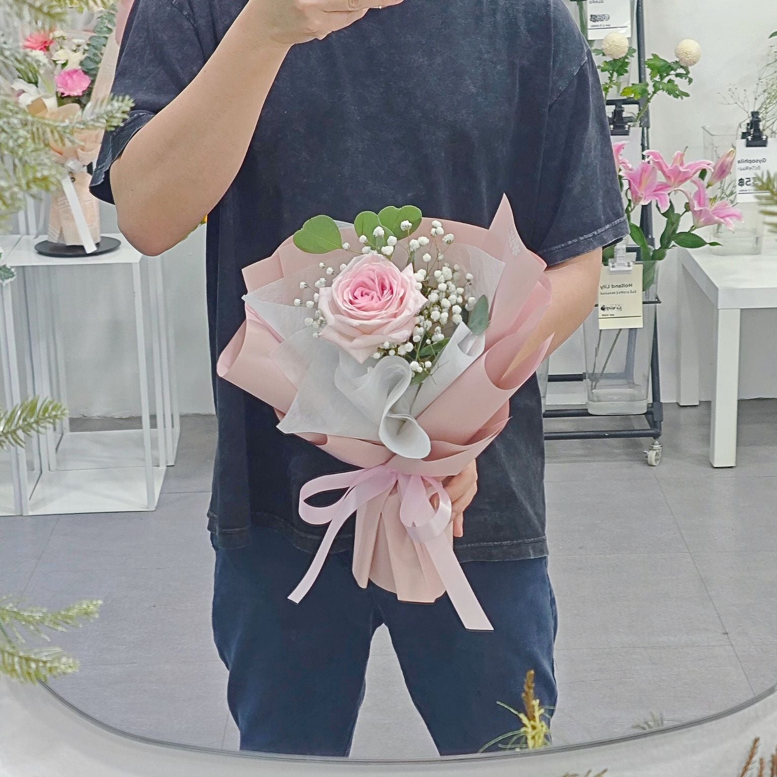 White baby’s breath and green foliage frame the rose lightly, allowing its natural form and scent to lead. Wrapped in blush pink paper with a soft white inner layer and finished with a pale pink ribbon, the overall feel is calm, tender, and intentionally understated.