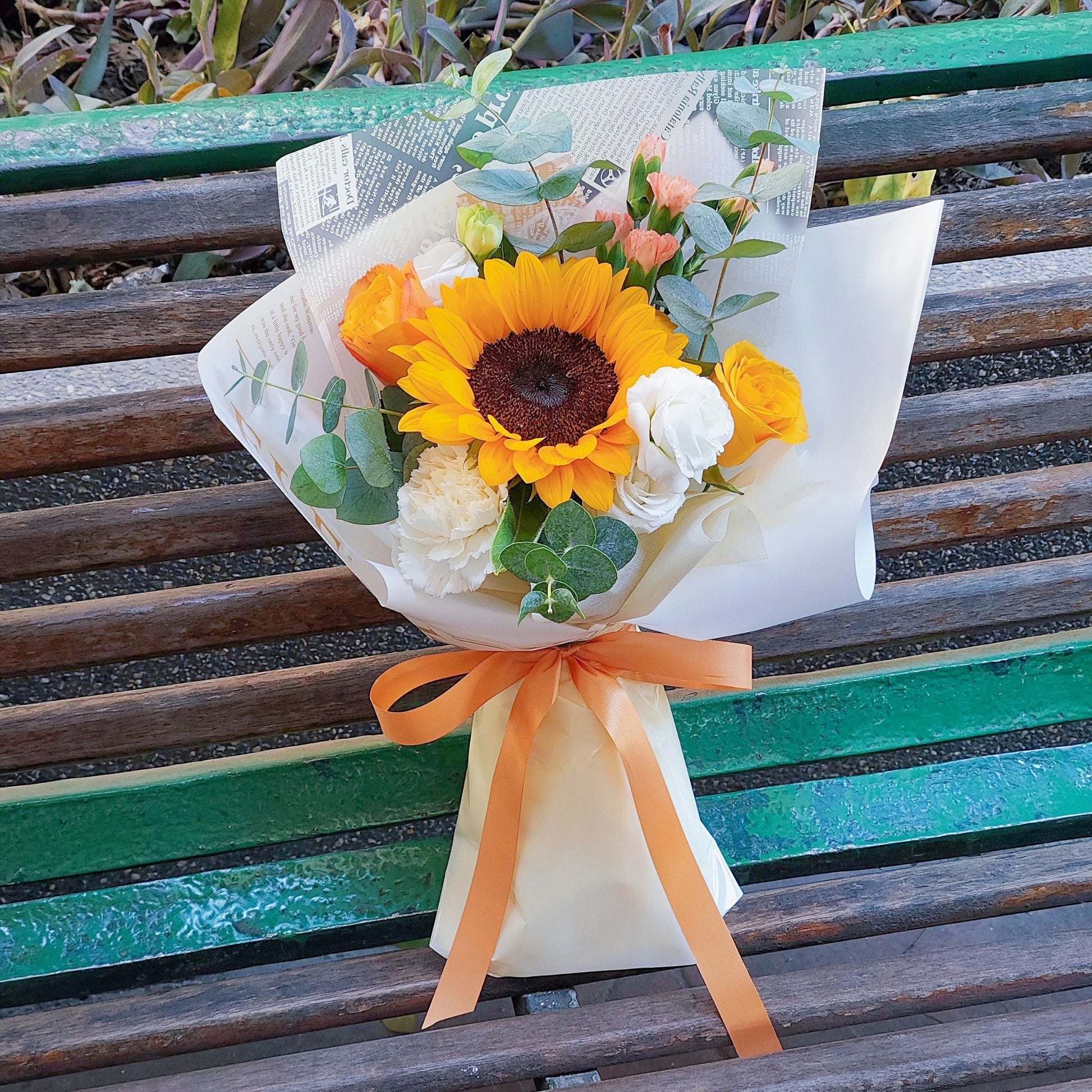 Sunflowers are like the life of the party, and when you pair them with soft white and warm-colored flowers, it's an explosion of sunshine! This small bouquet is perfect for sending good vibes on birthdays, or just bringing a little sunshine into someone's life. If you need to cheer someone up, this is your go-to gift â because who can resist the smile of a sunflower?