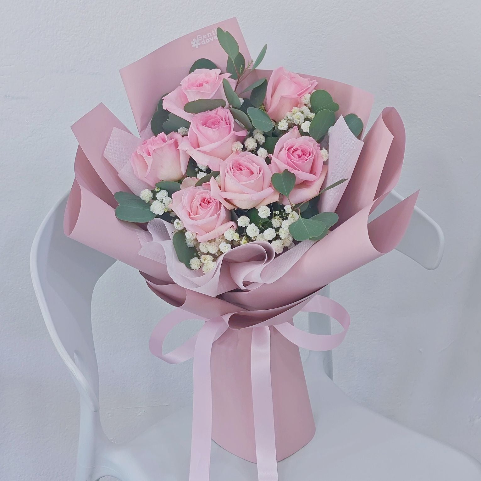 Silver dollar eucalyptus adds a clean, modern structure, while delicate white gypsophila brings a light, airy softness around the roses. Wrapped in blush pink paper and finished with a light pink satin ribbon, the bouquet feels tender, graceful, and intentionally held together.