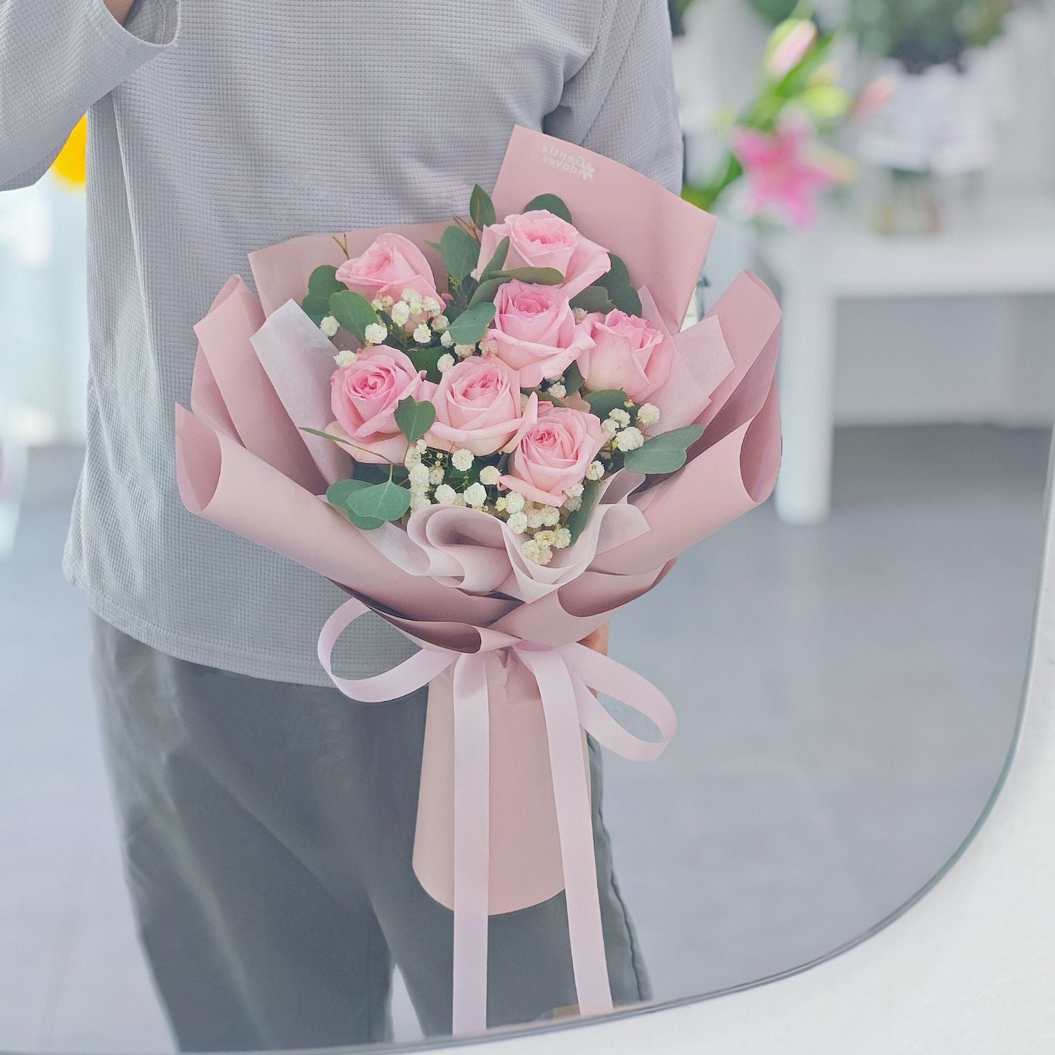 This Valentine’s bouquet features seven soft pink English roses, arranged to feel intimate and close. Their layered petals and gentle tone create a calm kind of romance — warm, thoughtful, and never overdone.