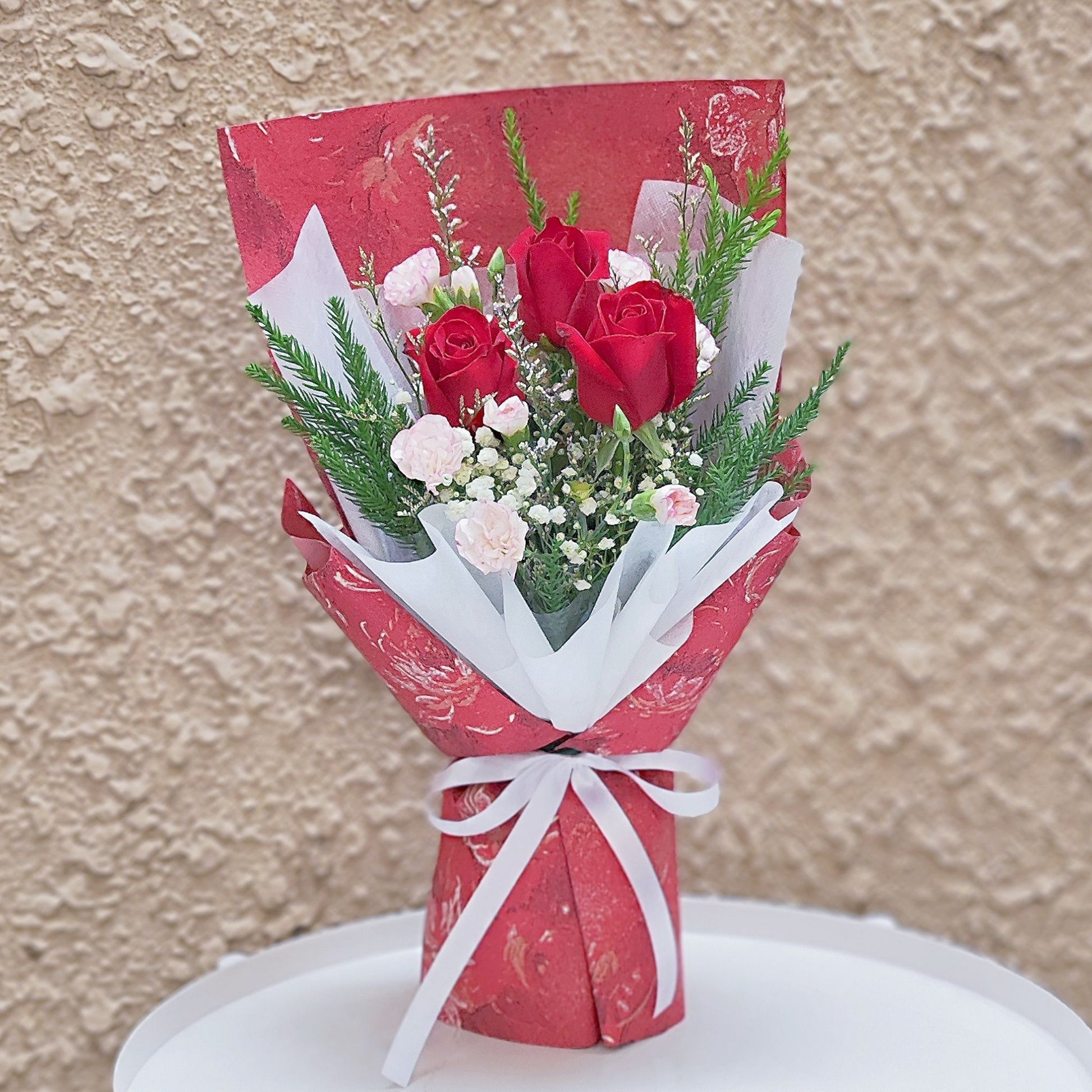 This vibrant bouquet features three striking red roses, symbolizing deep love and passion, complemented by lush greenery and wrapped in a bold red floral pattern paper. The vivid red hues and rich foliage create a stunning contrast, making this bouquet the perfect choice for romantic occasions, anniversaries, or to make a passionate statement of love and admiration.