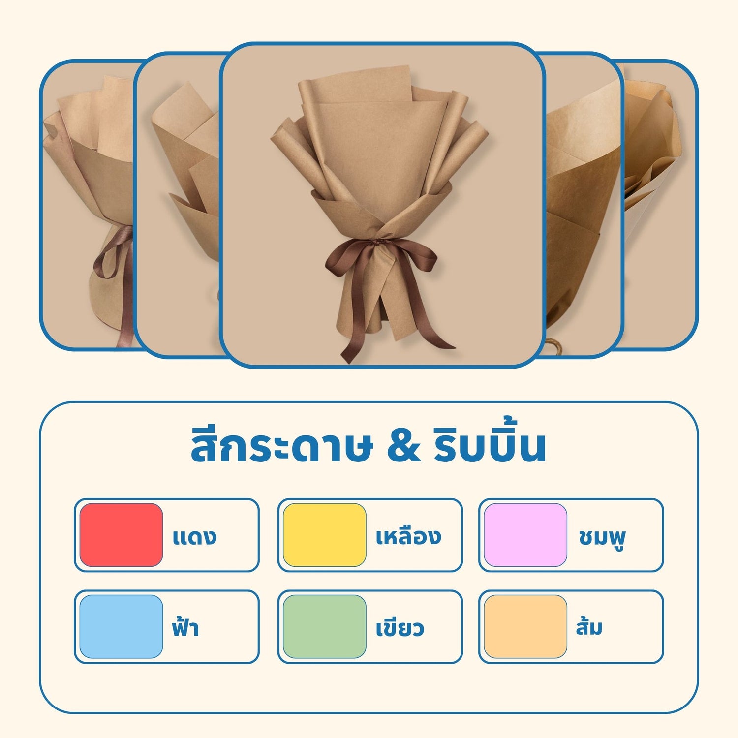 เลือกสไตล์และโทนสีกระดาษที่ต้องการ แล้วปิดท้ายด้วยริบบิ้นที่เข้ากับลุคของช่อดอกไม้