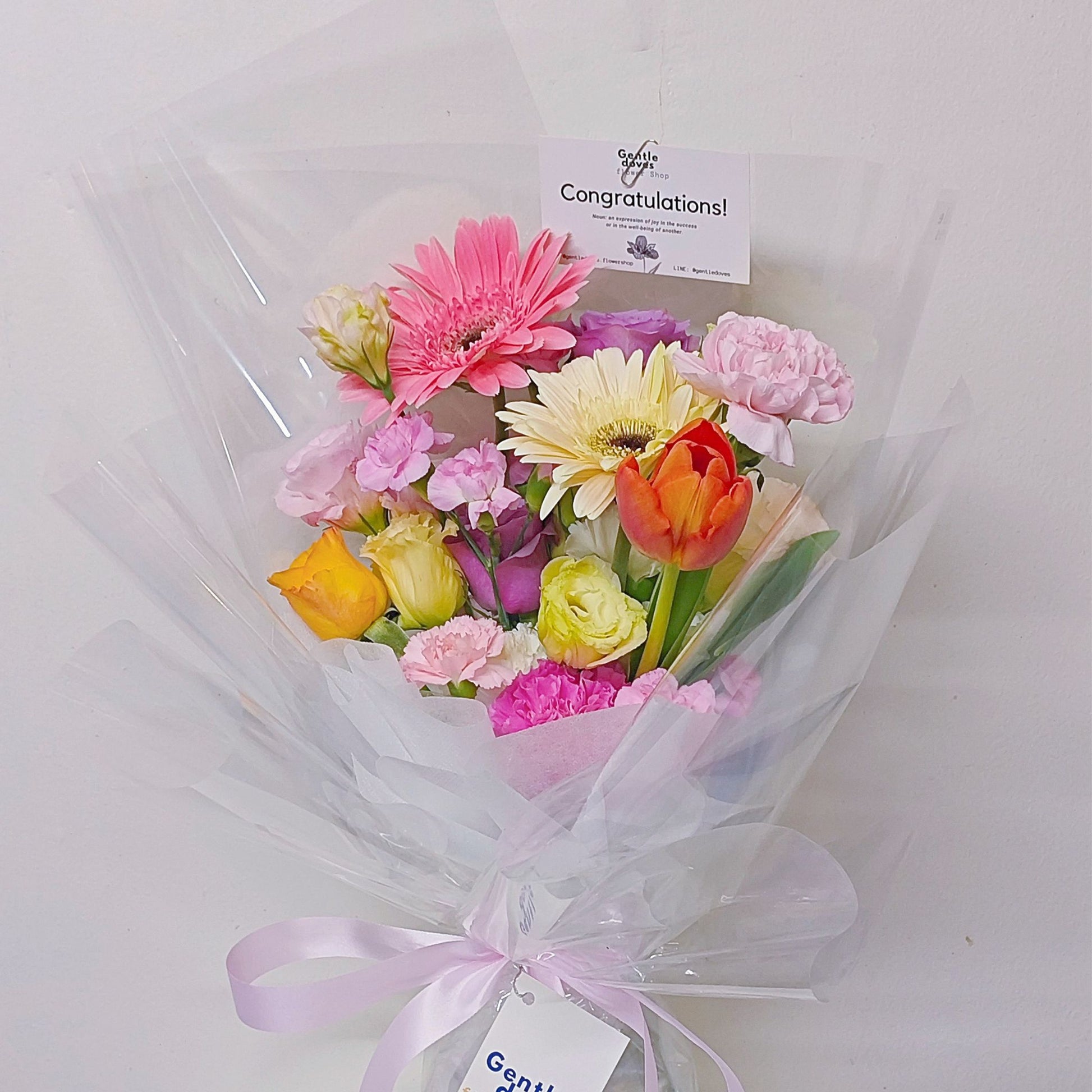 ช่อดอกไม้หลากสีนี้เป็นของขวัญที่สมบูรณ์แบบสำหรับการแสดงความยินดีในวันพิเศษ ด้วยดีไซน์ที่เรียบง่ายแต่หรูหรา ดอกไม้เหล่านี้จะช่วยเพิ่มความสดใสให้กับทุกห้อง ดอกไม้สีชมพู ขาว และส้มที่สดใส ถูกจัดอย่างสวยงามในช่อกระดาษใส สร้างความประทับใจอย่างมีเอกลักษณ์ ส่งมอบความยินดีด้วยของขวัญที่มีความหมายและน่าจดจำนี้