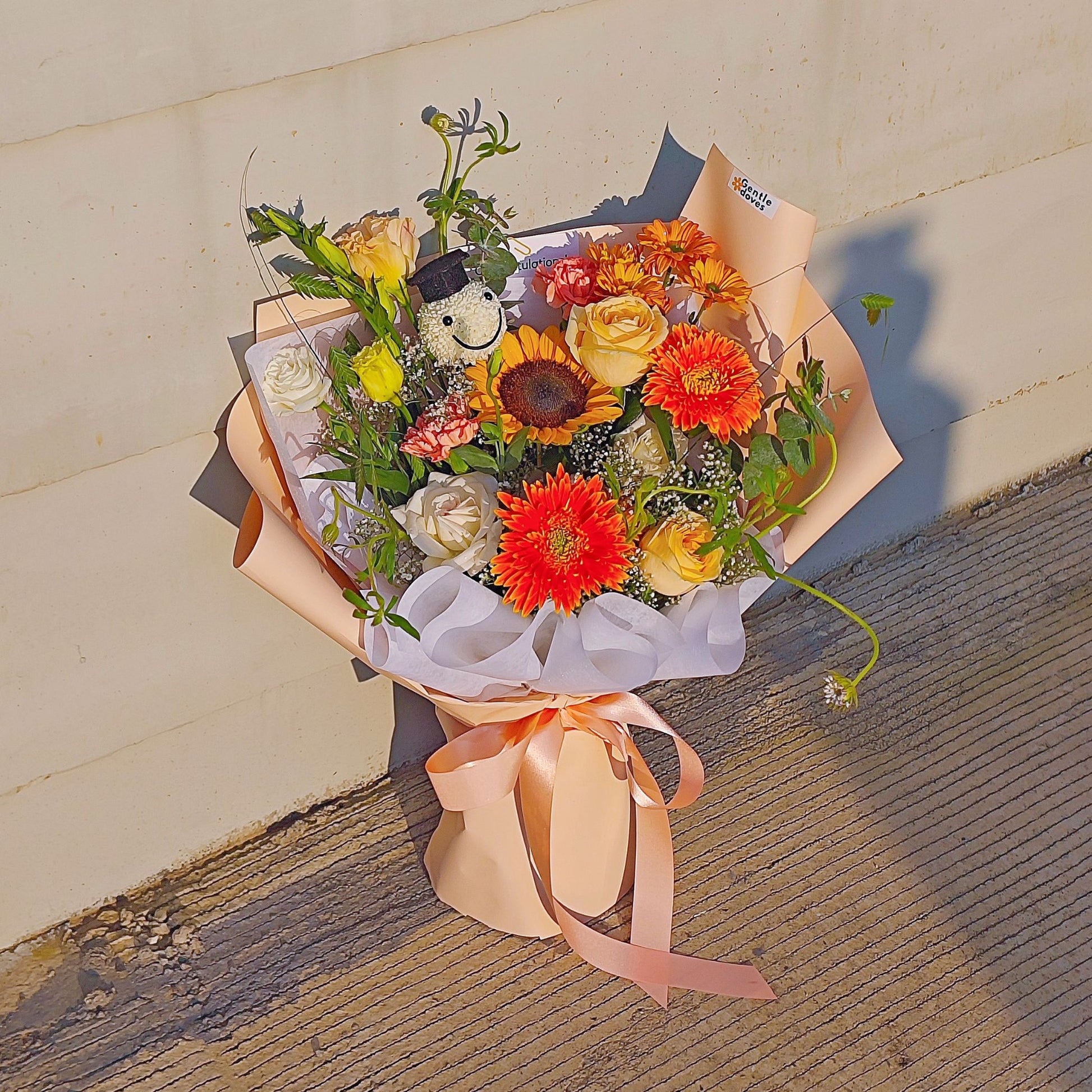 ช่อดอกไม้คละ โทนสีส้ม และ สีเหลือง กับ ดอกไม้หน้ายิ้มจบการศึกษา