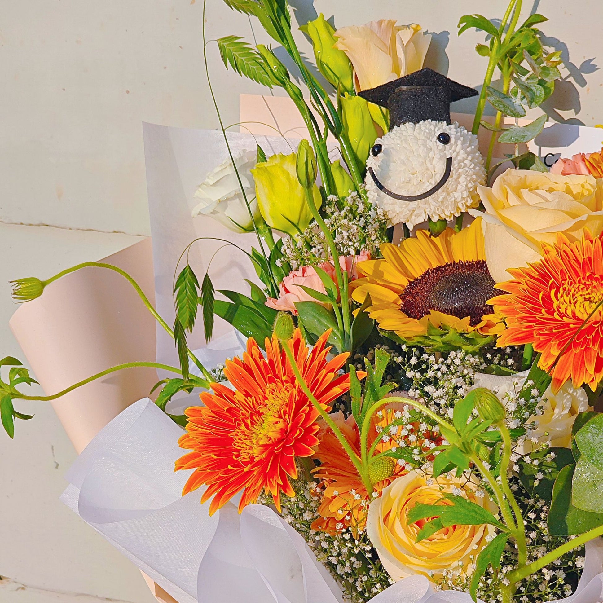 ช่อดอกไม้คละสีนี้มีโทนสีส้มและเหลืองสดใส เหมาะอย่างยิ่งสำหรับการเฉลิมฉลองพิธีสำเร็จการศึกษา สีสันที่สดใสเป็นของขวัญที่เต็มไปด้วยความหมายเพื่อแสดงความยินดีกับความสำเร็จในครั้งนี้