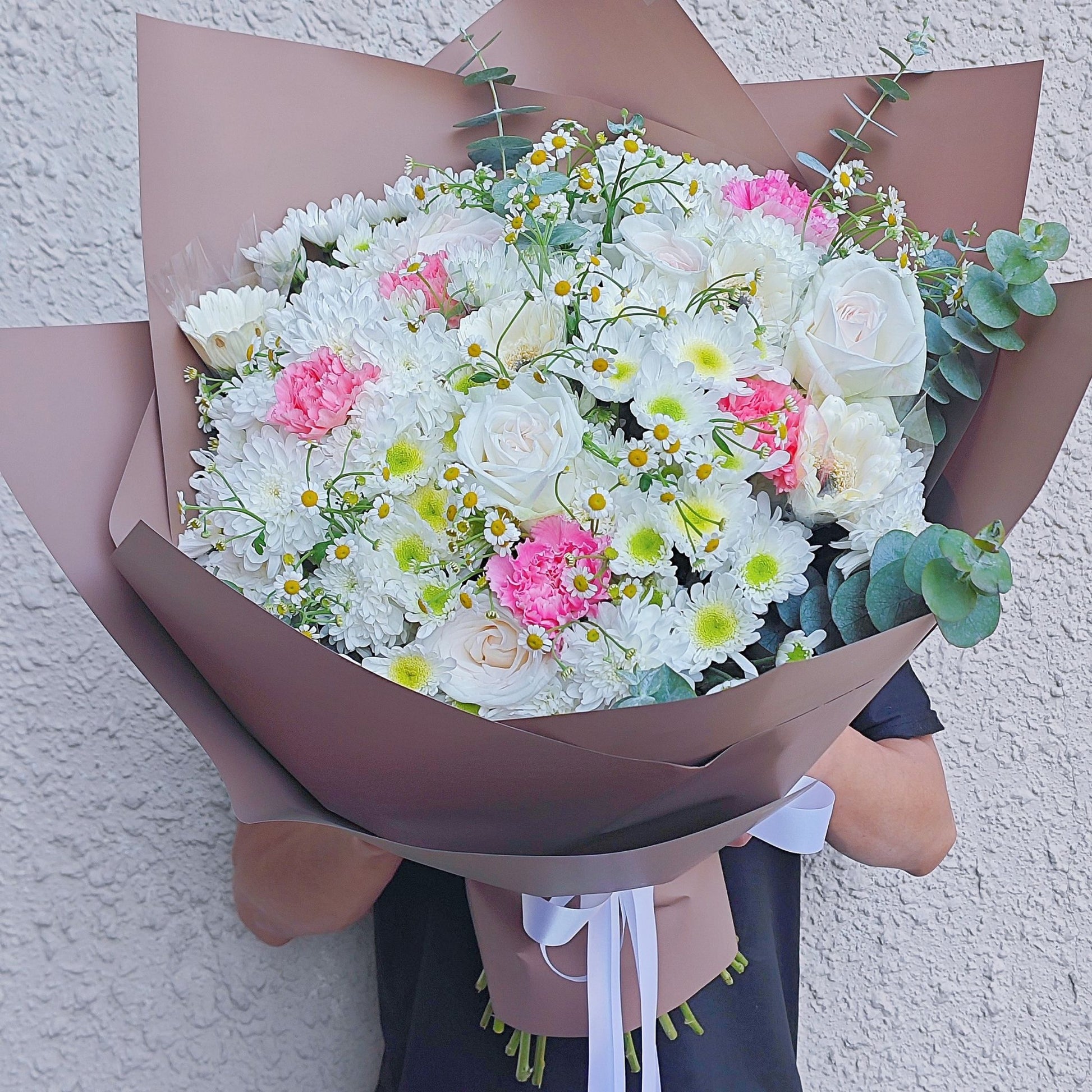 ช่อดอกไม้ขนาดใหญ่และสง่างามนี้ ประกอบด้วยเบญจมาศสีขาวและดอกไม้แซม มอบความสงบและความประณีต เหมาะสำหรับงานหรูหรา แสดงความเสียใจ หรือเป็นของขวัญที่สื่อถึงความจริงใจและความสงบ ด้วยปริมาณอันมากมาย จึงเหมาะอย่างยิ่งที่จะเป็นจุดเด่นของงานหรือเป็นช่อกลางโต๊ะ