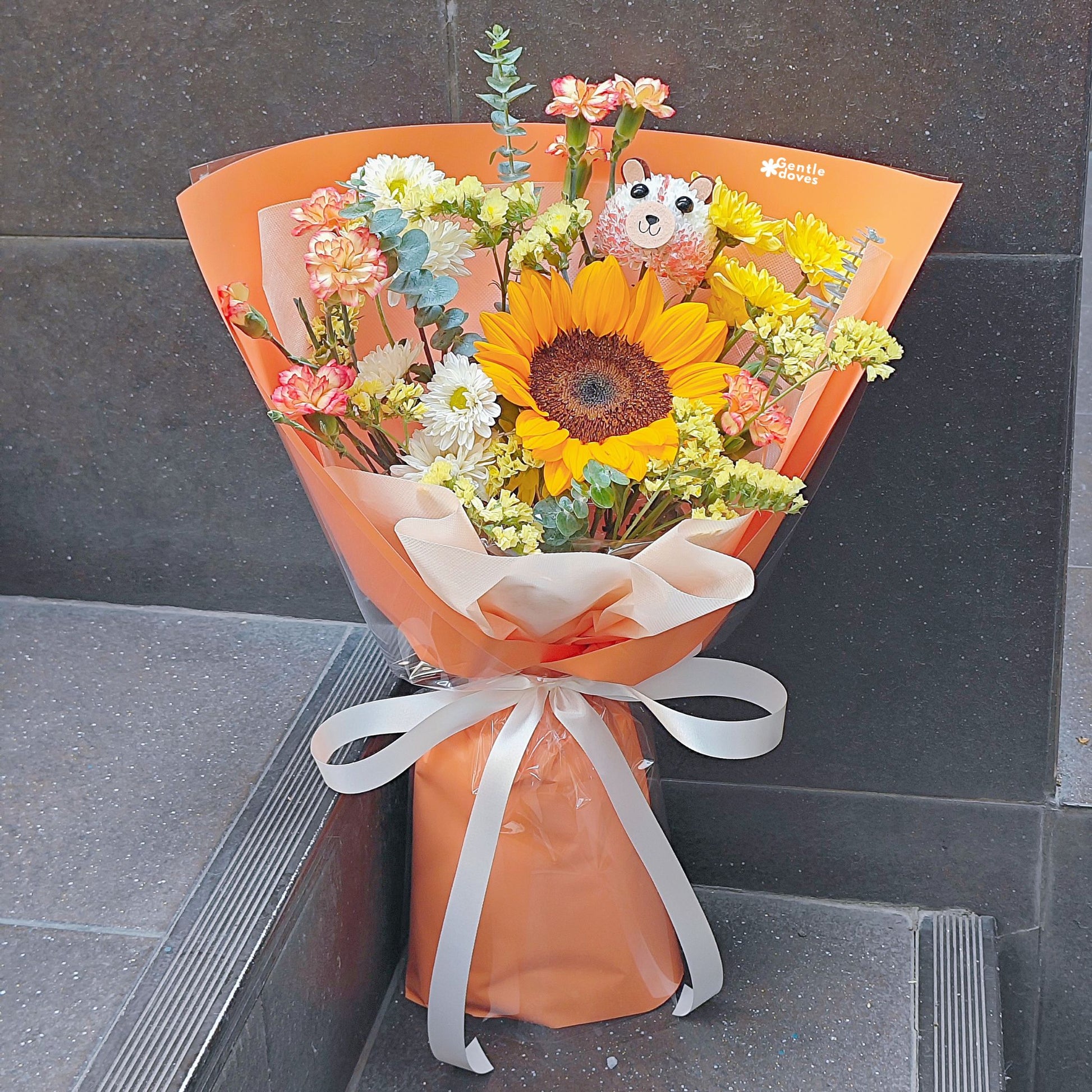 ช่อดอกไม้นี้น่ารักและสดใส ดอกทานตะวันสวยสดใส กับดอกไม้โทนสีส้ม-เหลืองแสนสนุก และตุ๊กตาหมีตกแต่งจากดอกไม้สุดน่ากอดที่ซ่อนอยู่ข้างใน