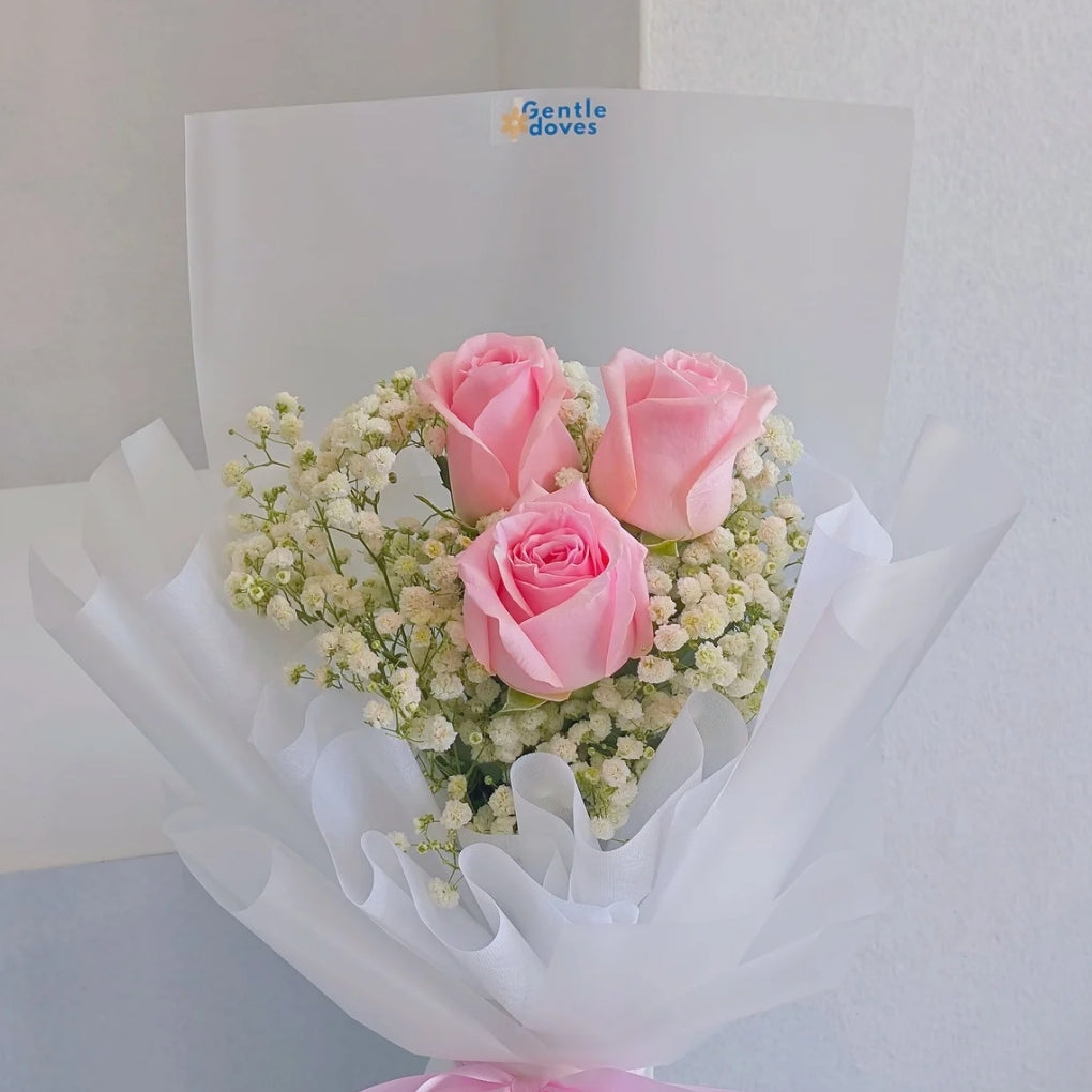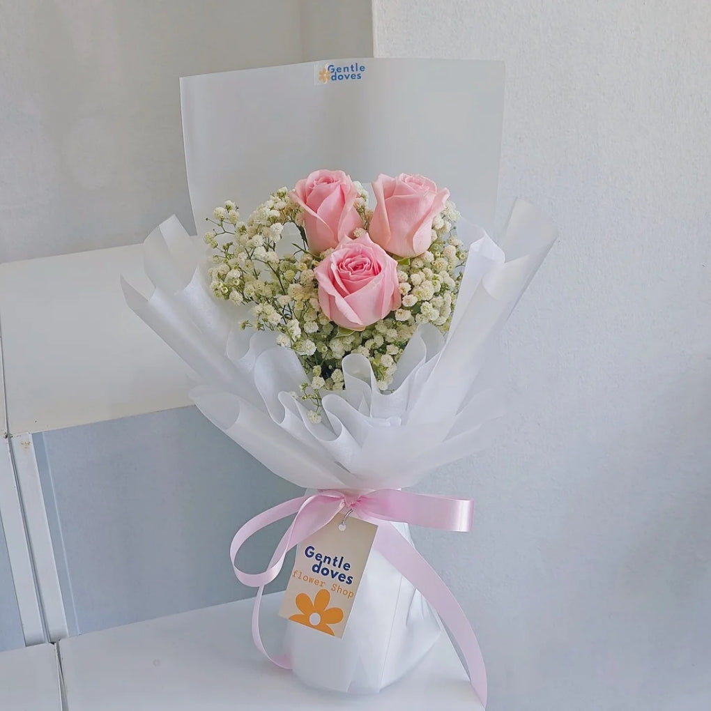 ช่อดอกไม้โทนอ่อนหวาน ใช้ กุหลาบชมพูอ่อน 3 ดอก คู่กับ ดอกยิปโซ เพิ่มความละมุน ห่อด้วยกระดาษสีใสด้านให้ลุคสะอาด เรียบง่าย และดูอ่อนโยน เหมาะสำหรับมอบเป็นของขวัญชิ้นเล็กๆ ที่เต็มไปด้วยความตั้งใจและความอบอุ่น