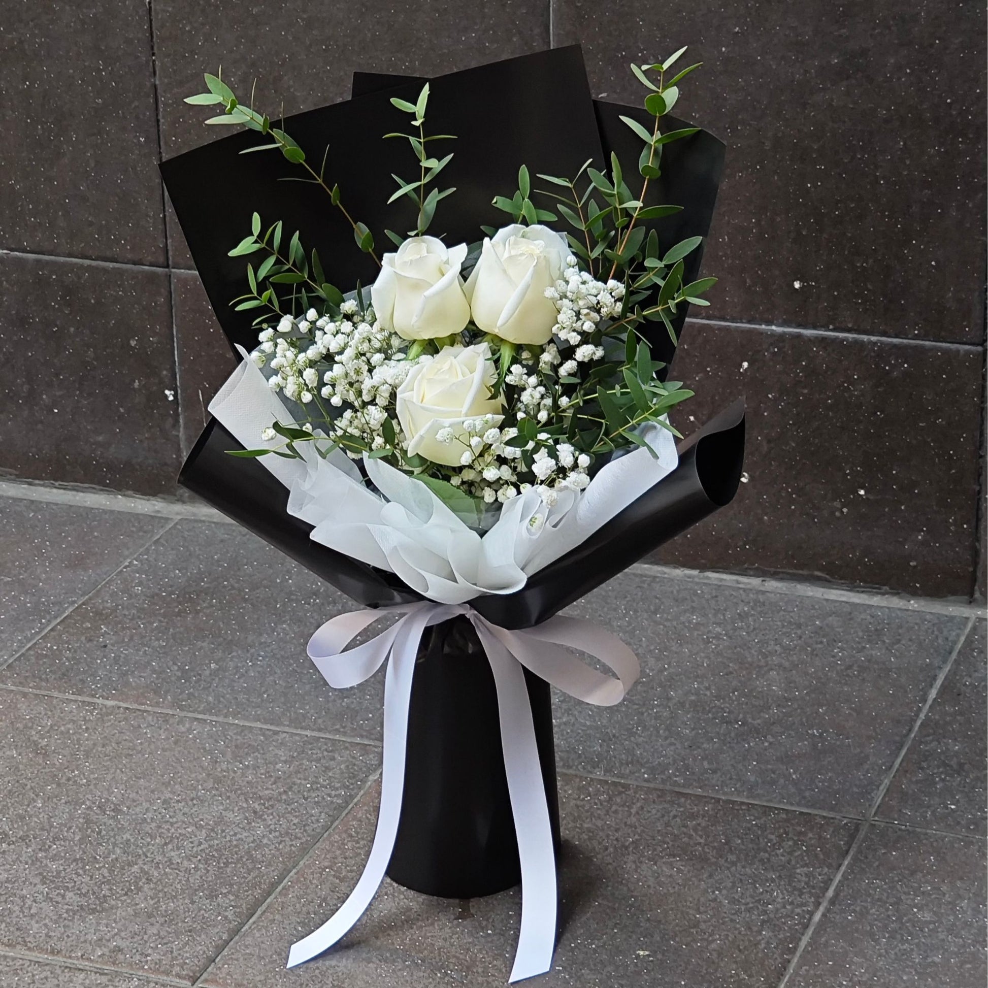 สง่างามและอ่อนช้อย ช่อดอกกุหลาบสีขาว 3 ดอก ประดับด้วยยิปโซฟิลล่าและใบยูคาลิปตัส ถ่ายทอดความบริสุทธิ์และความจริงใจ เป็นตัวเลือกที่หรูหราสำหรับการอำลา แสดงความเห็นใจ หรือแสดงความชื่นชมอย่างตั้งใจ