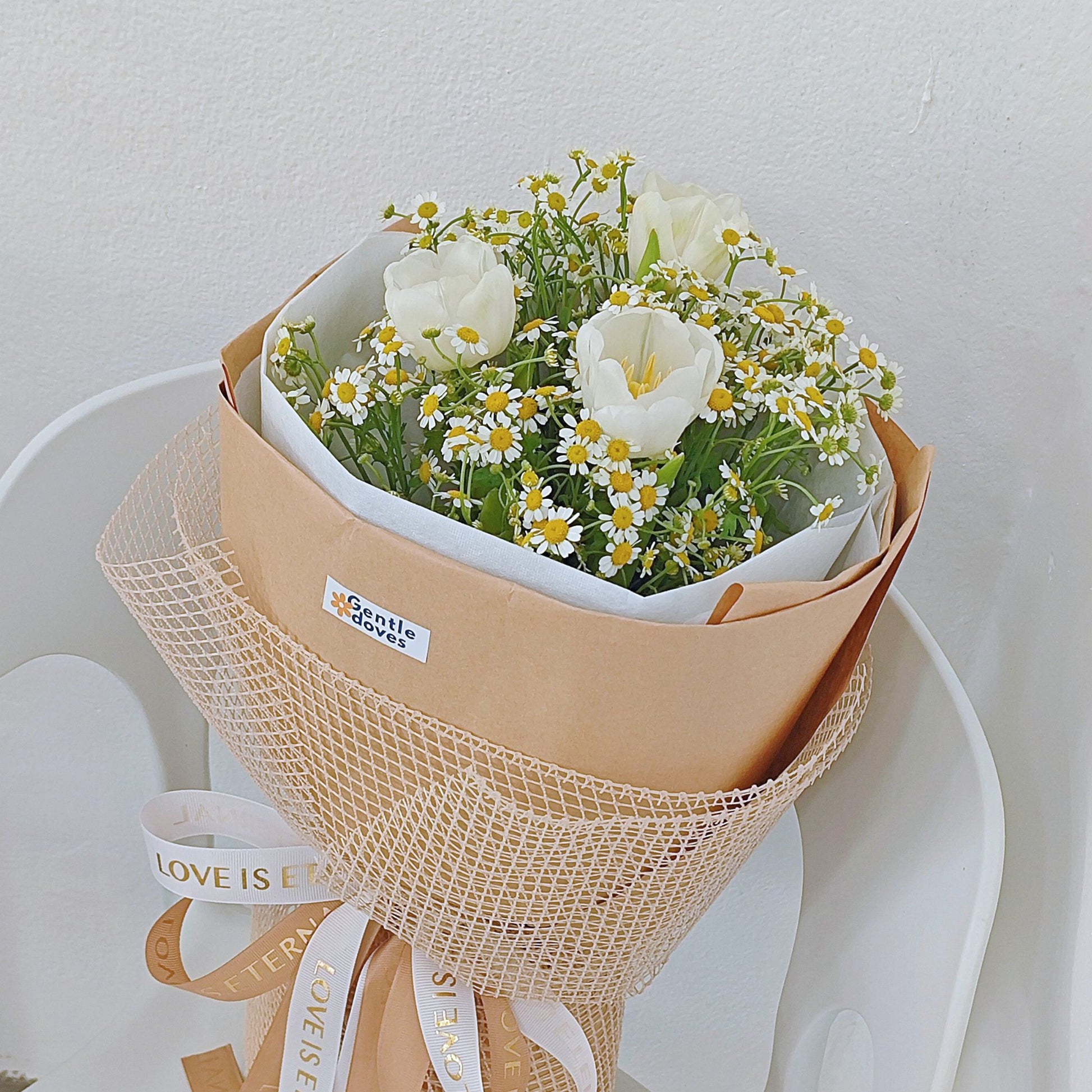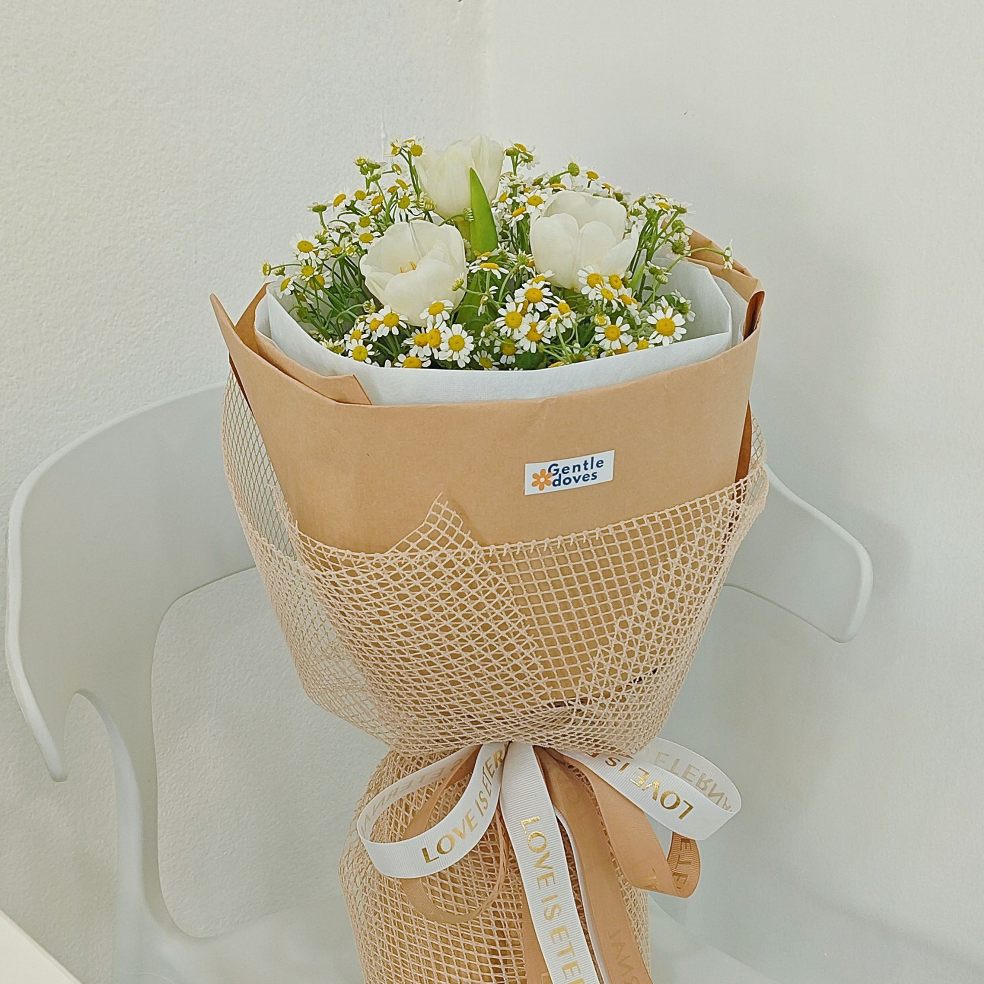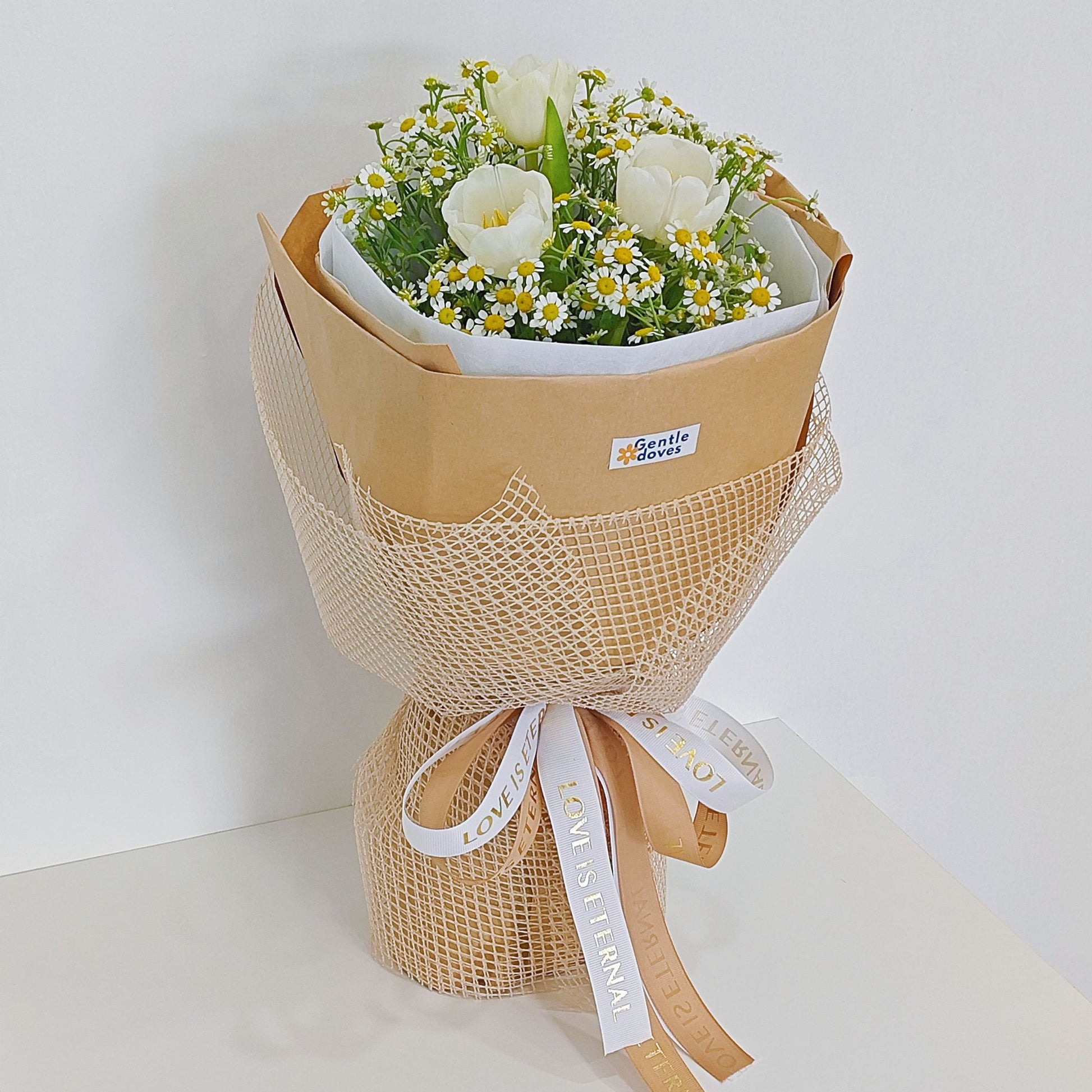 ช่อดอกทิวลิปสีขาว และ เดซี่ ห่อกระดาษคราฟท์คลาสสิก