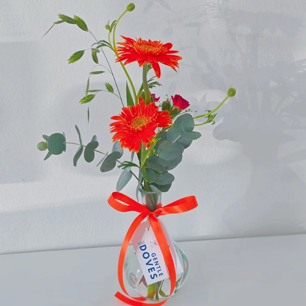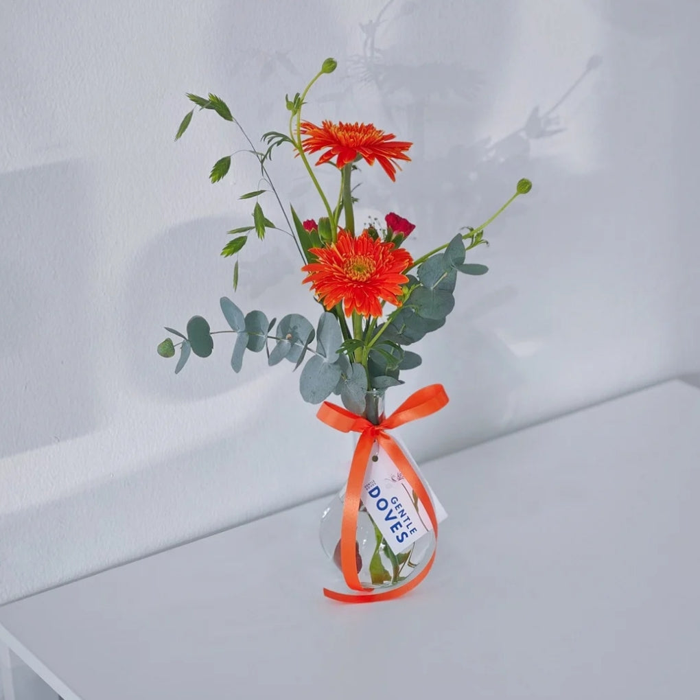 แจกันมินิที่เรียบง่ายแต่น่ารัก จัดด้วยดอกเยอบีร่าสองดอกคู่กับใบประดับทรงสวย ในแจกันแก้วทรงหยดน้ำผูกริบบิ้น เพิ่มความสดใสให้โต๊ะทำงาน มุมอ่านหนังสือ หรือพื้นที่ขนาดเล็กได้อย่างพอดี